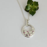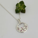 The silver pendant has an added detail of 5 pink sapphires fush set. I love this little sparkly detail.