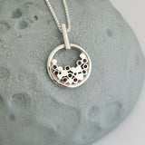 • The round silver pendant features five rubies, flush set for a subtle yet striking detail