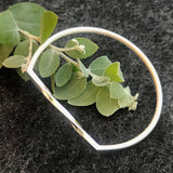 This bangle has a polished twisted square top, contrasted by a matte sterling silver round band.