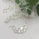 35mm wide and 40mm round from the top of the hoop to the bottom of the circle design.