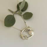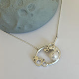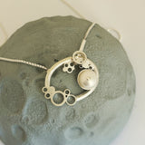 This handmade sterling silver pendant features a pearl, paired with a curved sterling silver chain and a distinctive front closure design.